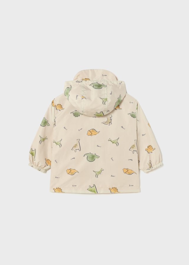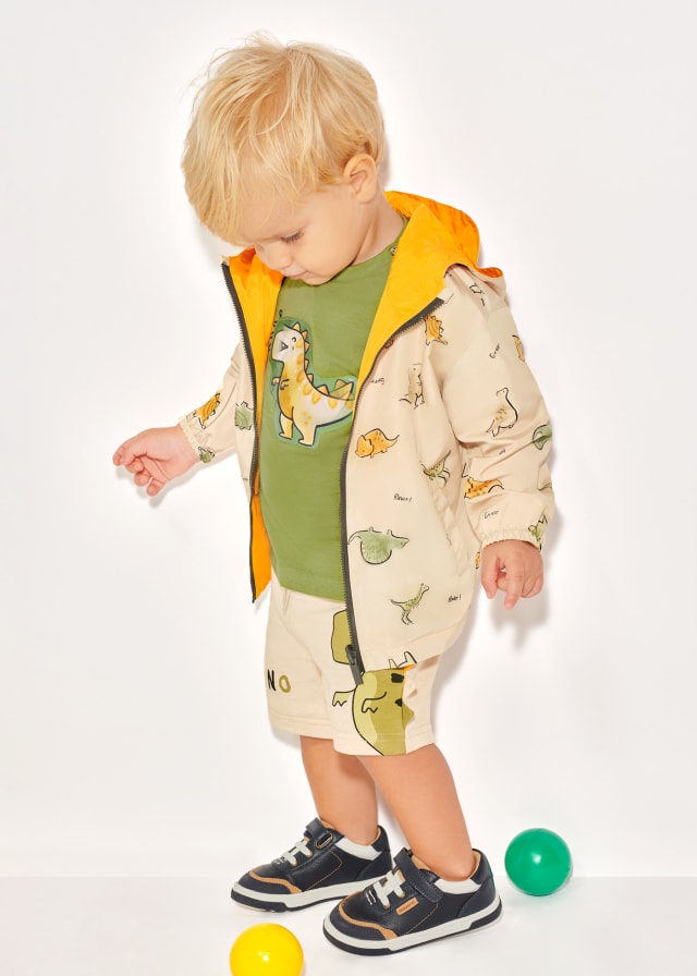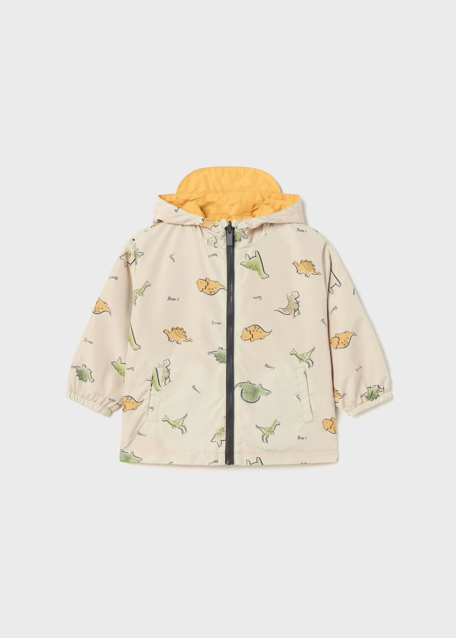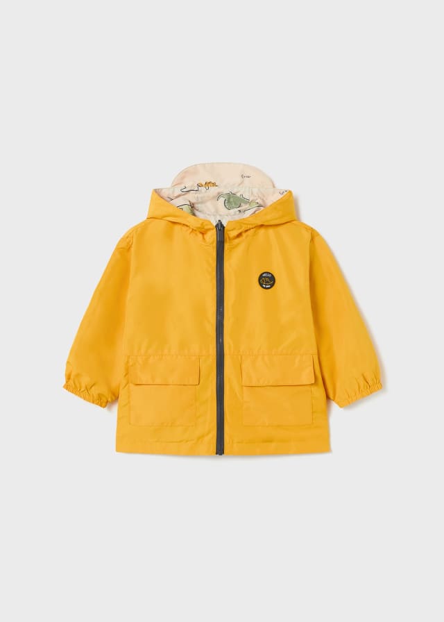 Chamarra rompevientos de manga larga para bebé. Cuello con capucha. Capucha con visera. Cierre central delantero con cremallera. Bolsillos en los laterales. Este modelo presenta un diseño reversible.