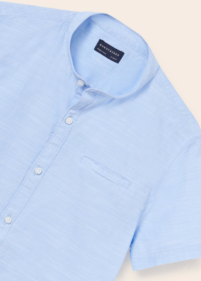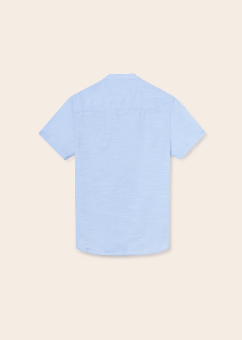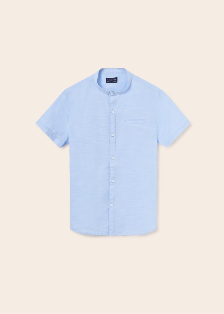 Prenda ECOFRIEND 100% algodón sostenible. Camisa de manga corta para chico. Modelo con cuello mao al tono. Cierre con botones en la parte delantera. Bolsillo funcional en la parte delantera.